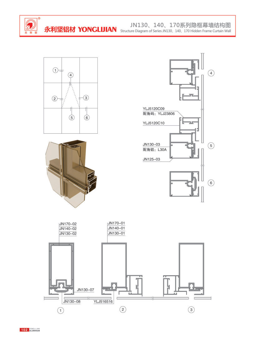 Jn130, 140, 170 series hidden frame and semi hidden frame curtain wall